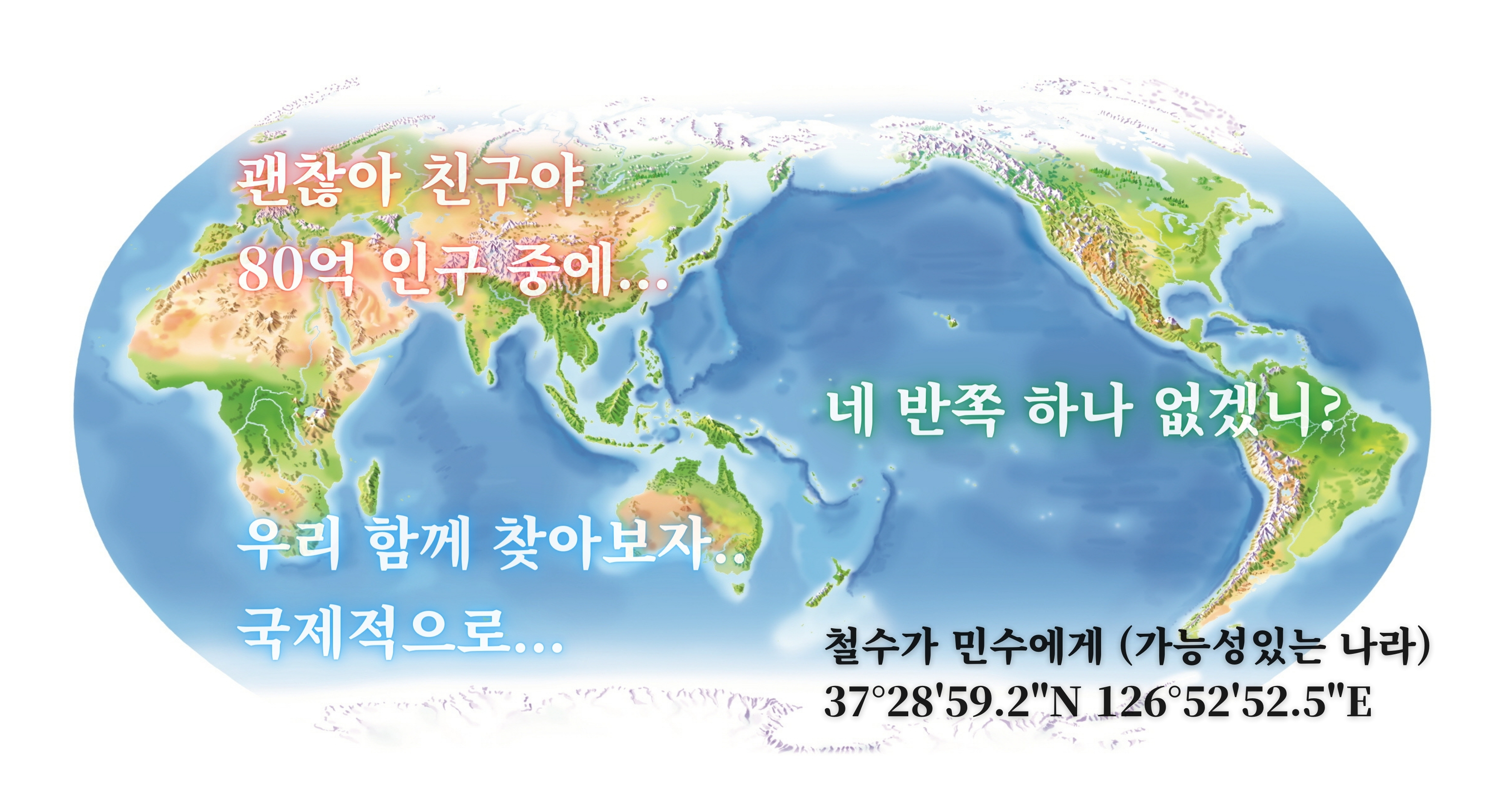 이때 세계지도가 들어가는 만큼 아래와 같은 문구들이 들어가면 재미있을 것 같습니다.