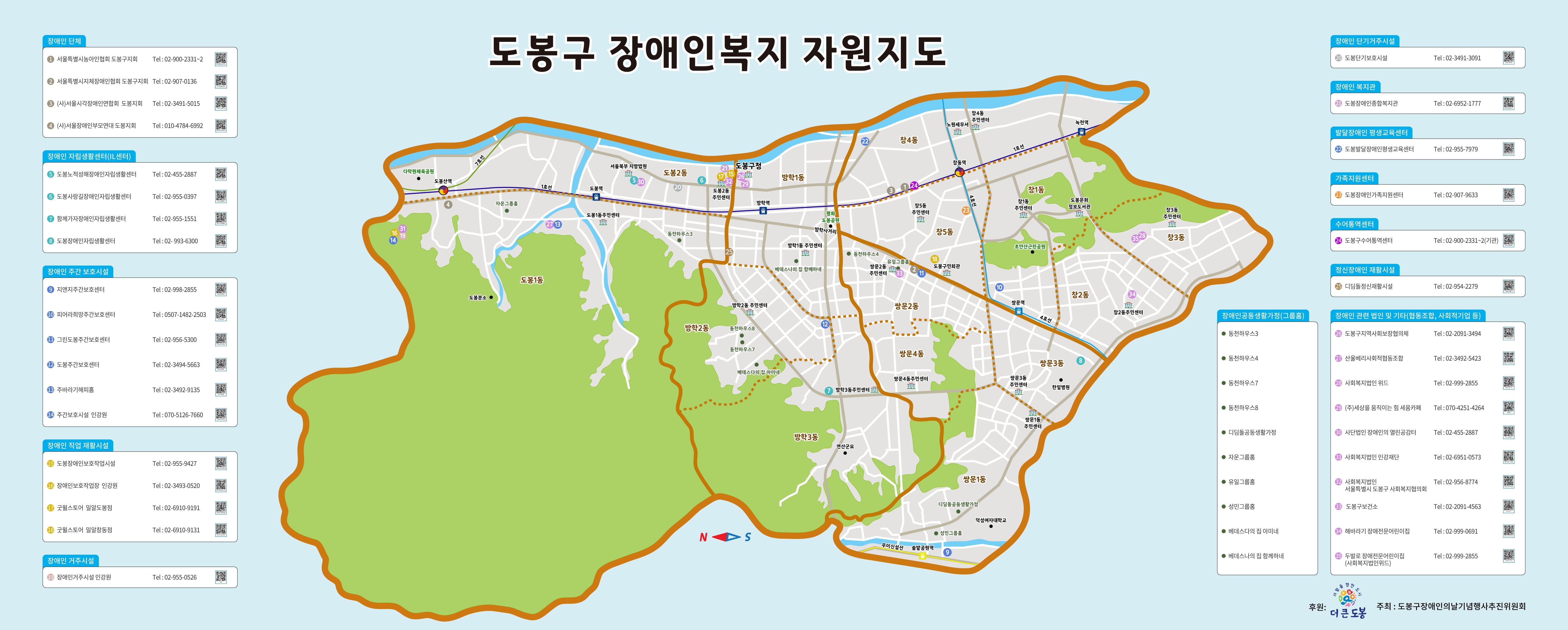 * 장애인 관련 법인 및 기타(협동조합, 사회적기업 등) 26 도봉구지역사회보장협의체 Tel : 02-2091-3494 27 산울베리사회적협동조합 Tel : 02-3492-5423 | 28 사회복지법인 위드 Tel: 02-999-2855 29 (주)세상을 움직이는 힘 세움카페 Tel : 070-4251-4264 30 사단법인 장애인의 열린공감터 Tel : 02-455-2887 31 사회복지법인 인강재단 Tel : 02-6951-0573 32 사회복지법인 서울특별시 도봉구 사회복지협의회 Tel : 02-956-8774 33 도봉구보건소 Tel : 02-2091-4563 34 해바라기 장애전문어린이집 Tel : 02-999-0691 35 두발로 장애전문어린이집 (사회복지법인위드) Tel : 02-999-2855