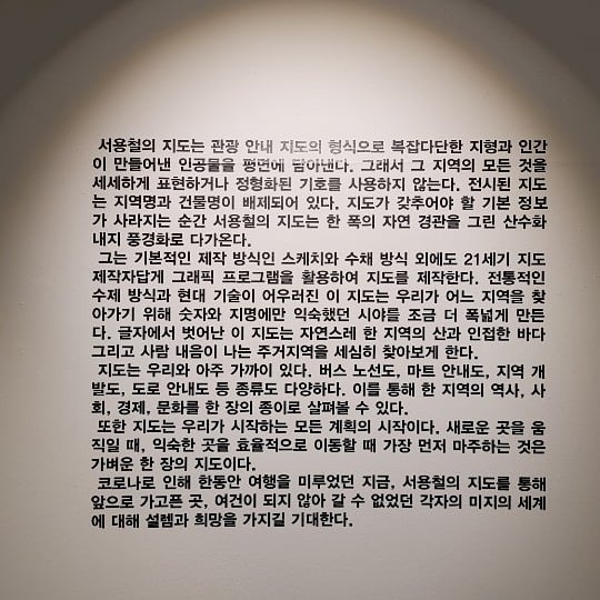 요즘 네이버, 다음, 구글 등의 인터넷 상에서 손쉽게 볼 수 있는 디지털로 이루어진 지도가 아닌 지도를 하나의 작품으로 아날로그 감성과 사람 사는 정이 느껴지는 지도를 감상하실 수 있는 기회였습니다.