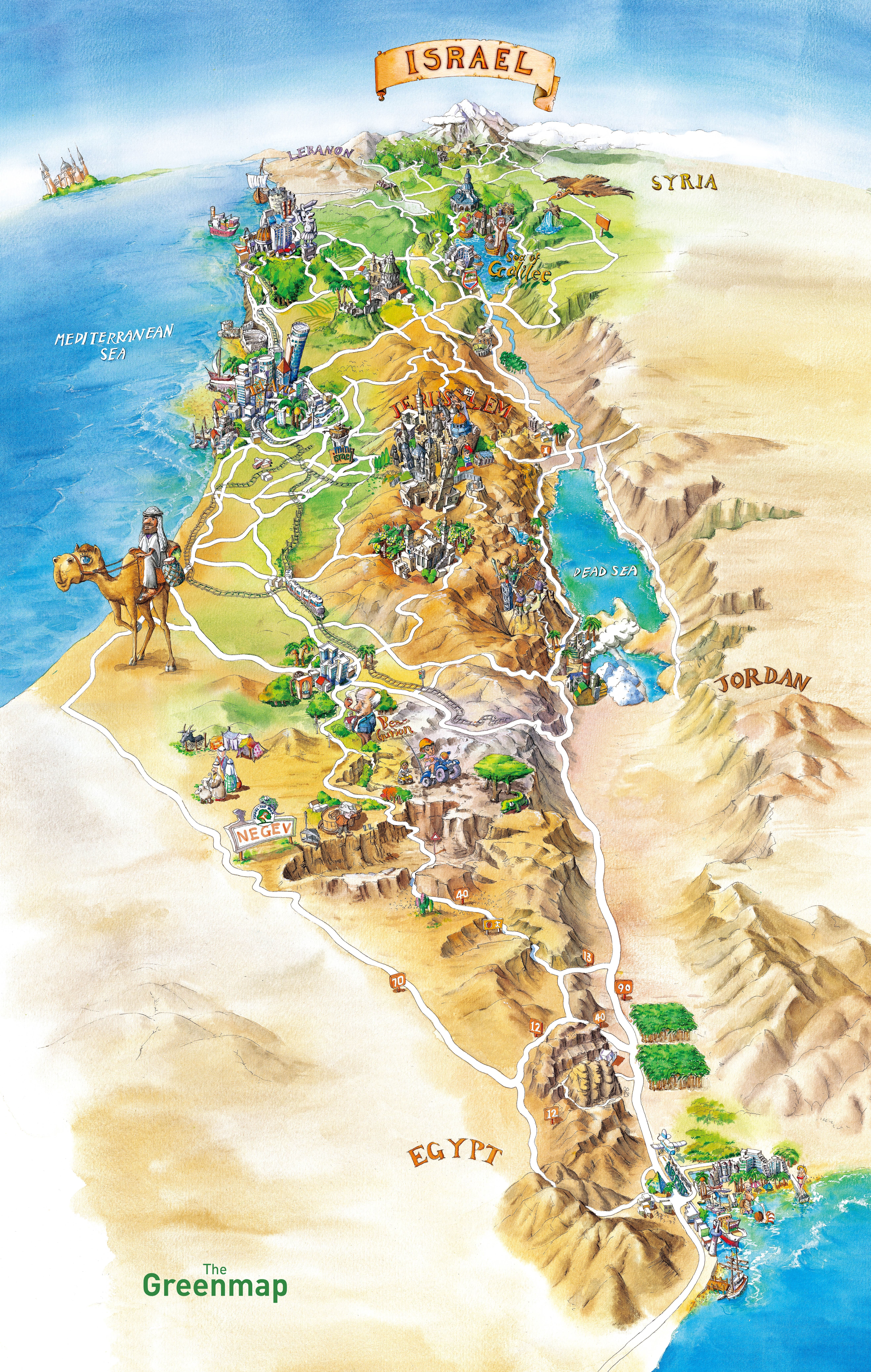 이스라엘 영토를 하늘에서 내려다보는 조감도 스타일로 구성했고,